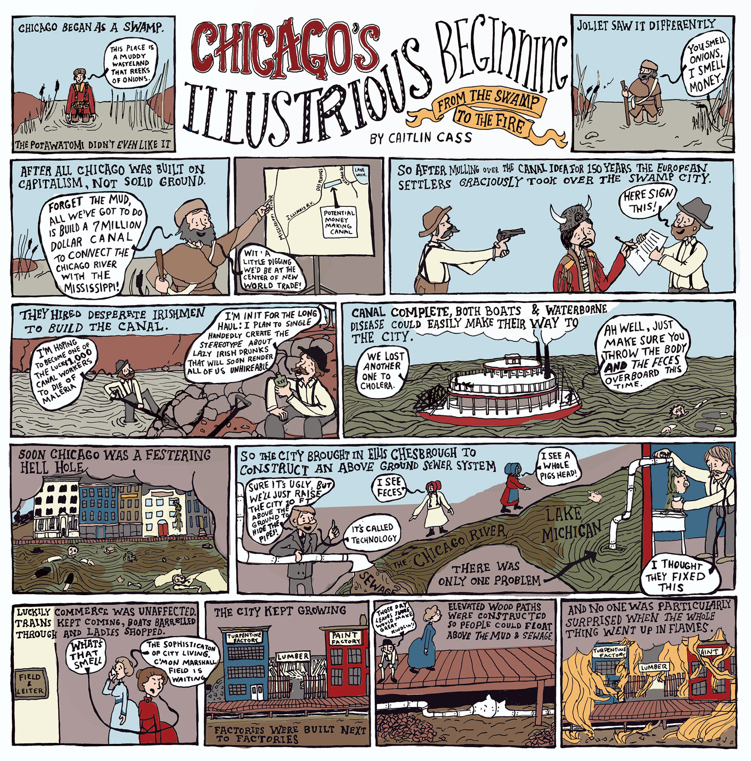 This comic covers the Chicago's inglorious past, from it's origin's in the swamp to the reversal of the Chicago River and the wonders of meatpacking.